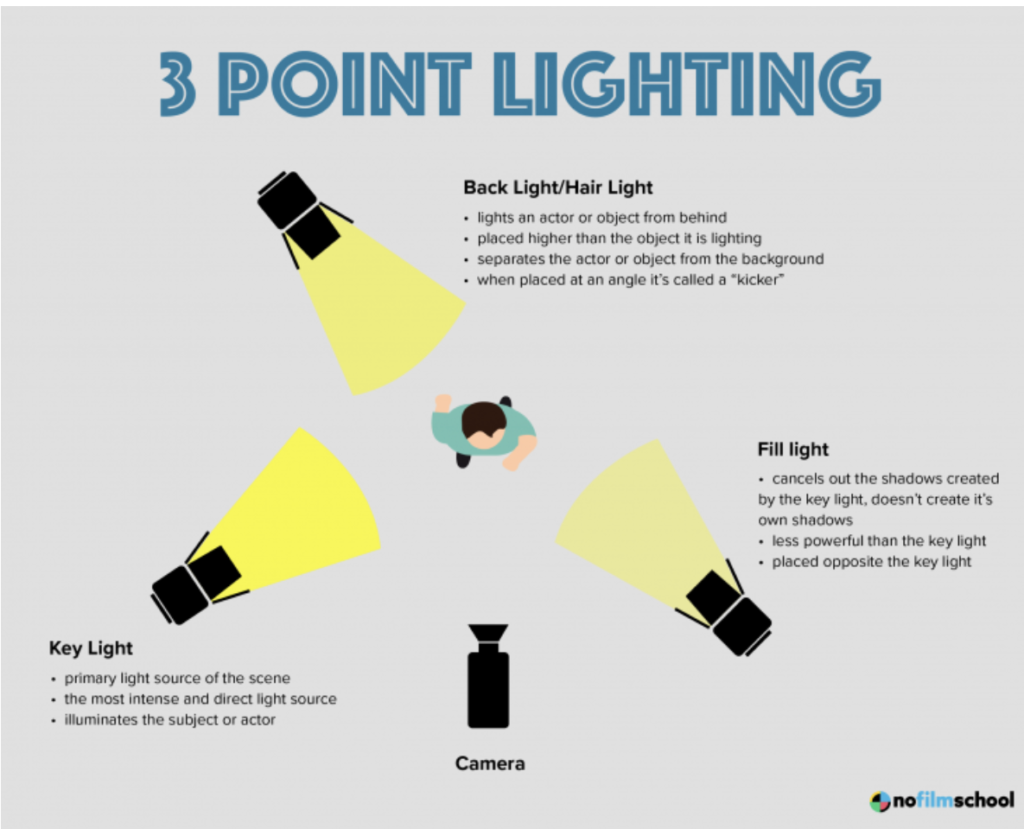 - Setup your 3 point lighting according to the diagram above. (They do not have to be the same kind of lights)